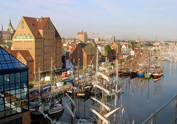Promenade entlang der Kaikante des Rostocker Stadthafens zwischen